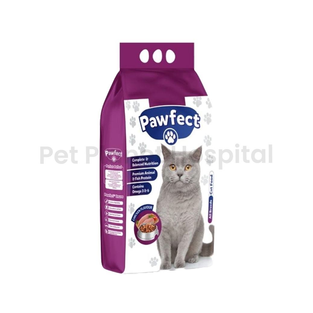 Pawfect Cat Food is a nutritious chicken-based formula made to support the daily health of both adult cats and kittens. It provides essential proteins, vitamins, and minerals that help improve digestion, support immunity, and maintain healthy growth. The kitten formula supports early development, while the adult food helps keep cats active and strong. Available in 1kg and 500g packs, Pawfect Cat Food is easy to serve and ideal for regular feeding. You can order original Pawfect Cat Food online from the Pet Planet Hospital Store, trusted for genuine pet products and fast delivery across Karachi and all over Pakistan.
