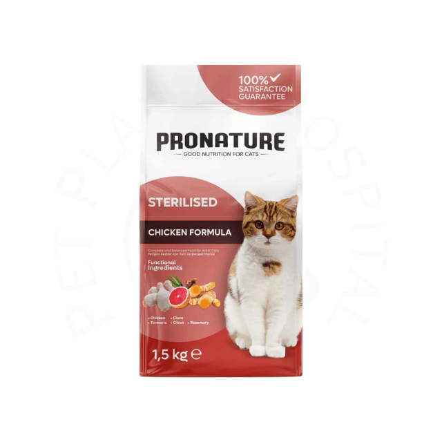 Pronature Sterilized Cat 1.5kg Chicken provides complete nutrition for sterilized adult cats, featuring high-quality chicken protein for muscle maintenance and energy. Balanced vitamins and minerals help control weight, support healthy digestion, and maintain a shiny coat. Carefully crafted kibble ensures easy chewing and nutrient absorption for everyday feeding. Visit our Pet Planet online store for safe, authentic Pronature products with fast delivery across Karachi and all over Pakistan.
